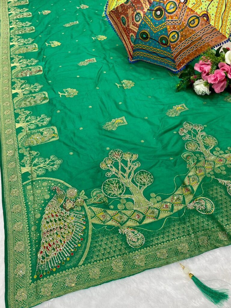 Emerald Green Soft Silk Saree with Zari Peacock & Tree Work