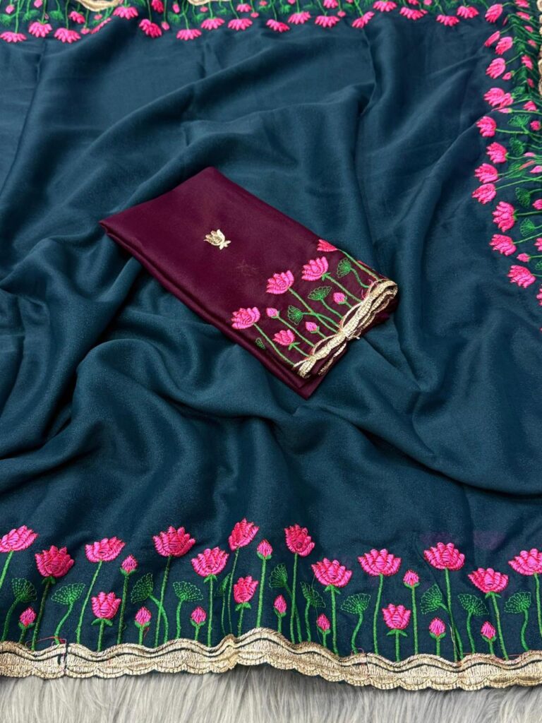 Embroidered Georgette Saree with Silver Zari Scalloped Border
