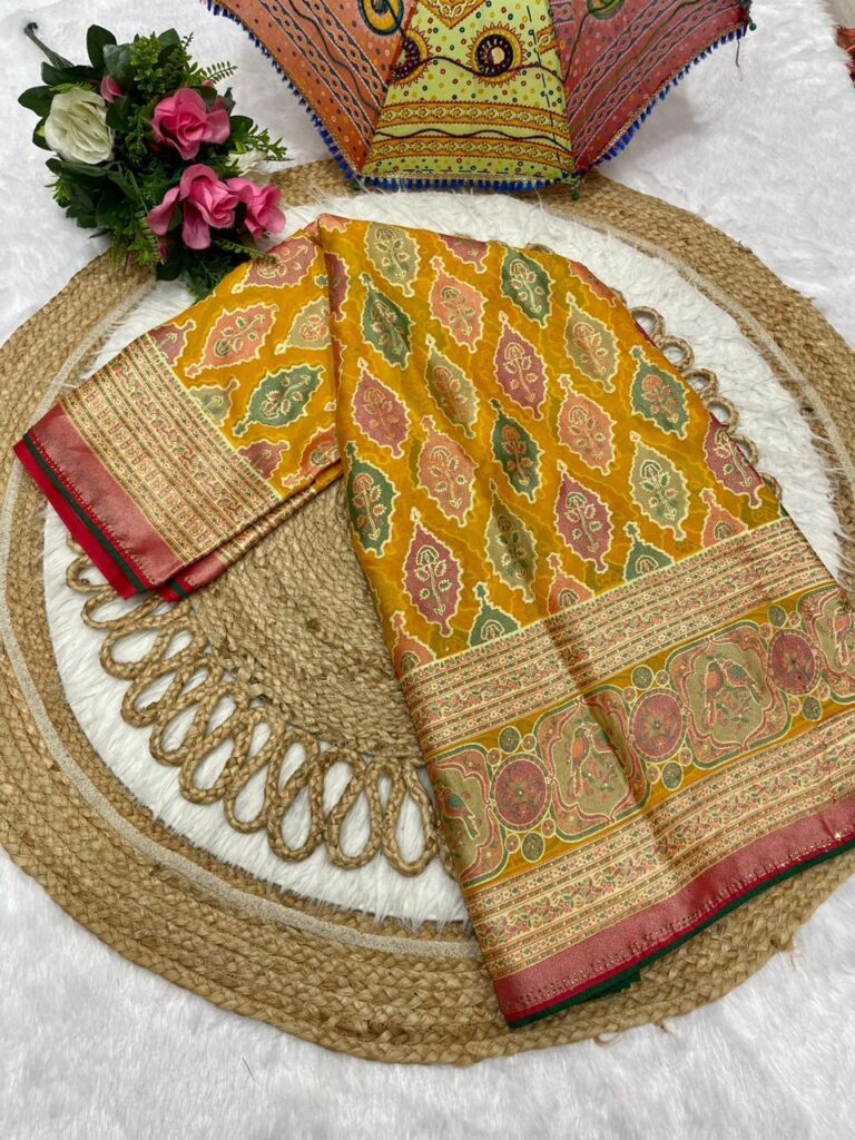 Floral & Ornate Print Chiffon Saree with Antique Zari Border