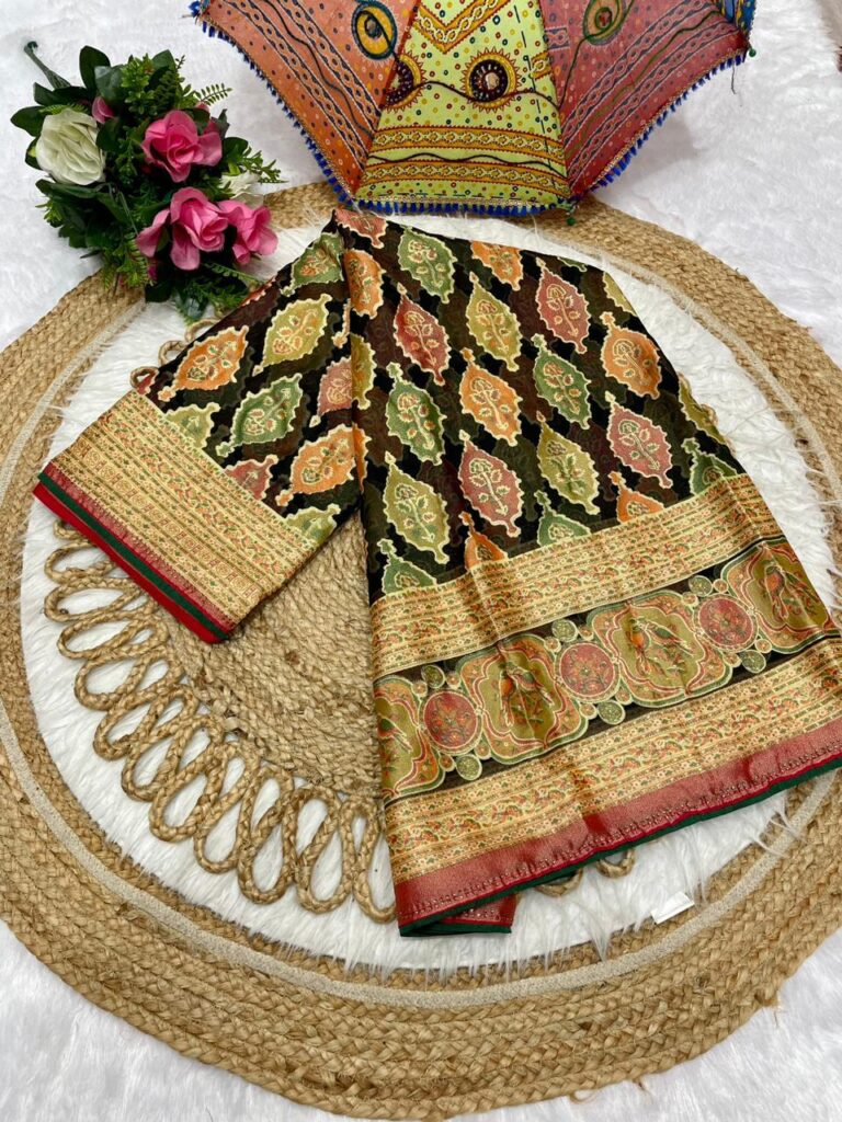 Floral Print Black Chiffon Saree with Antique Zari Border