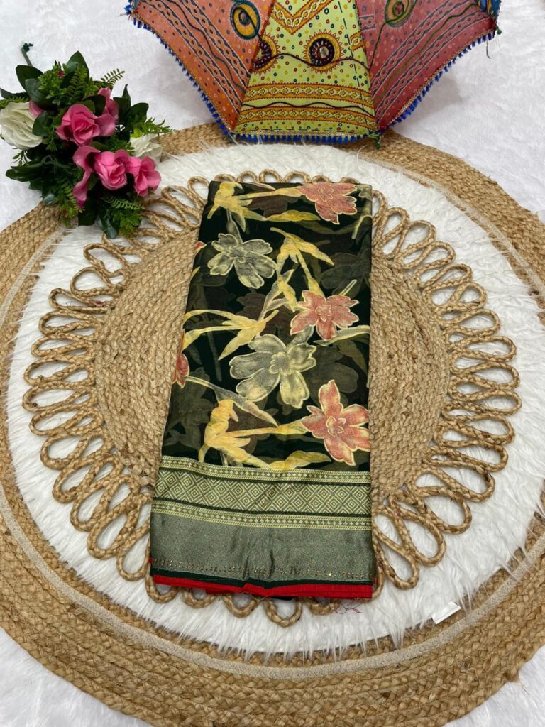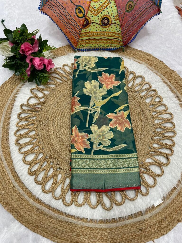 Floral Print Bottle Green Chiffon Saree with Zari Border