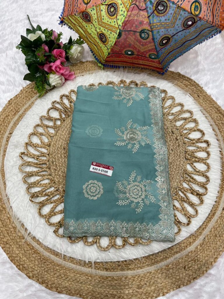 Embroidered Georgette Saree with Silver Zari Scalloped Border