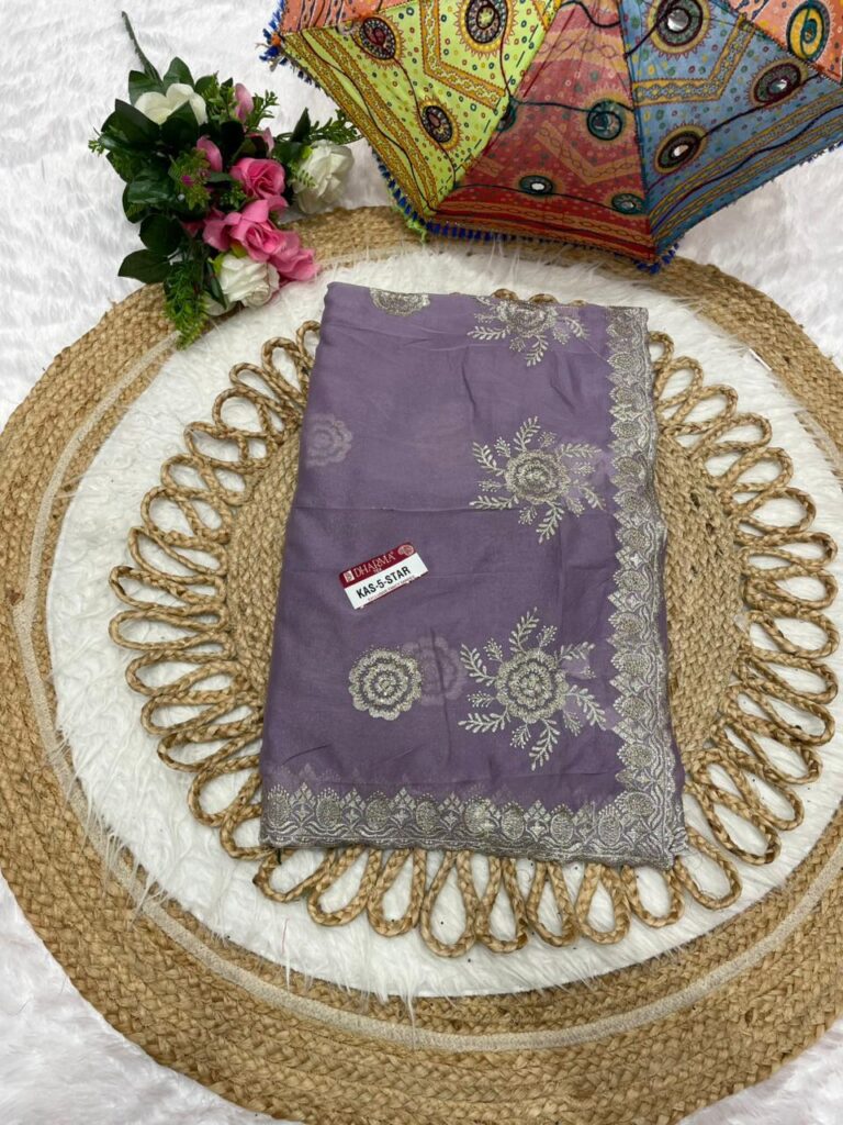 Embroidered Georgette Saree with Silver Zari Scalloped Border