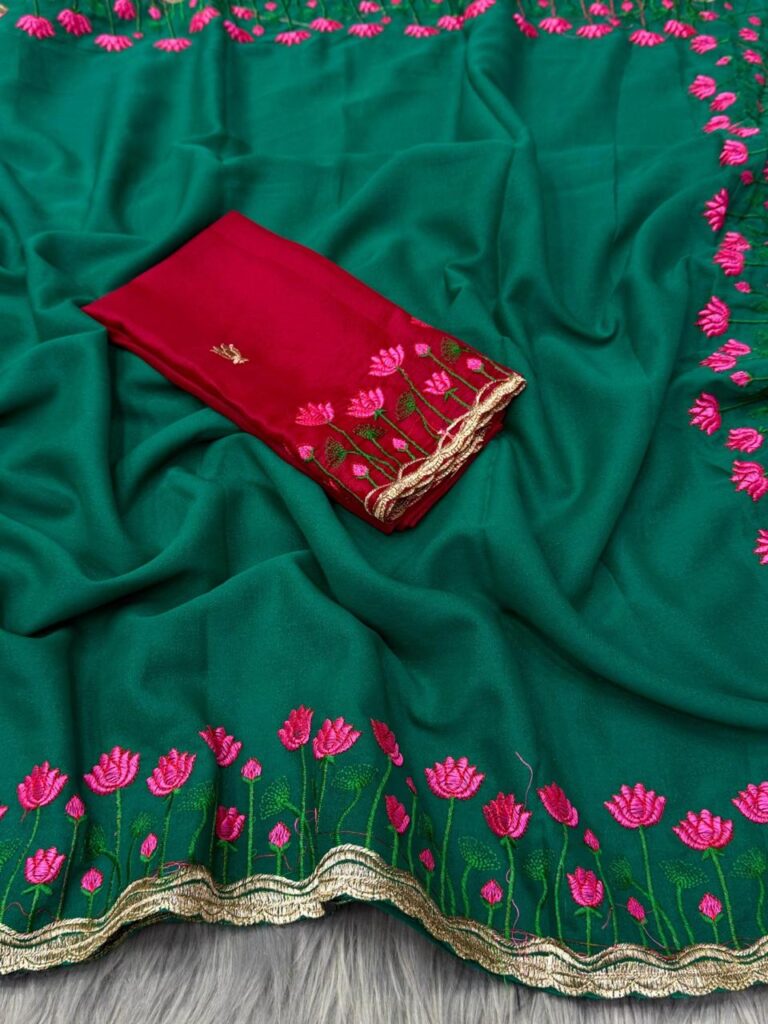 • Saree Pattern & Design: This exquisite saree from the “Exclusive Fancy Saree” range features delicate, sprawling floral embroidery motifs distributed across the body. The design is characterized by circular, rose-like “butti” patterns and elaborate floral vines crafted with shimmering silver zari. The standout feature is the intricate scalloped border, meticulously detailed with dense needlework that adds a high-fashion boutique finish to the entire drape.