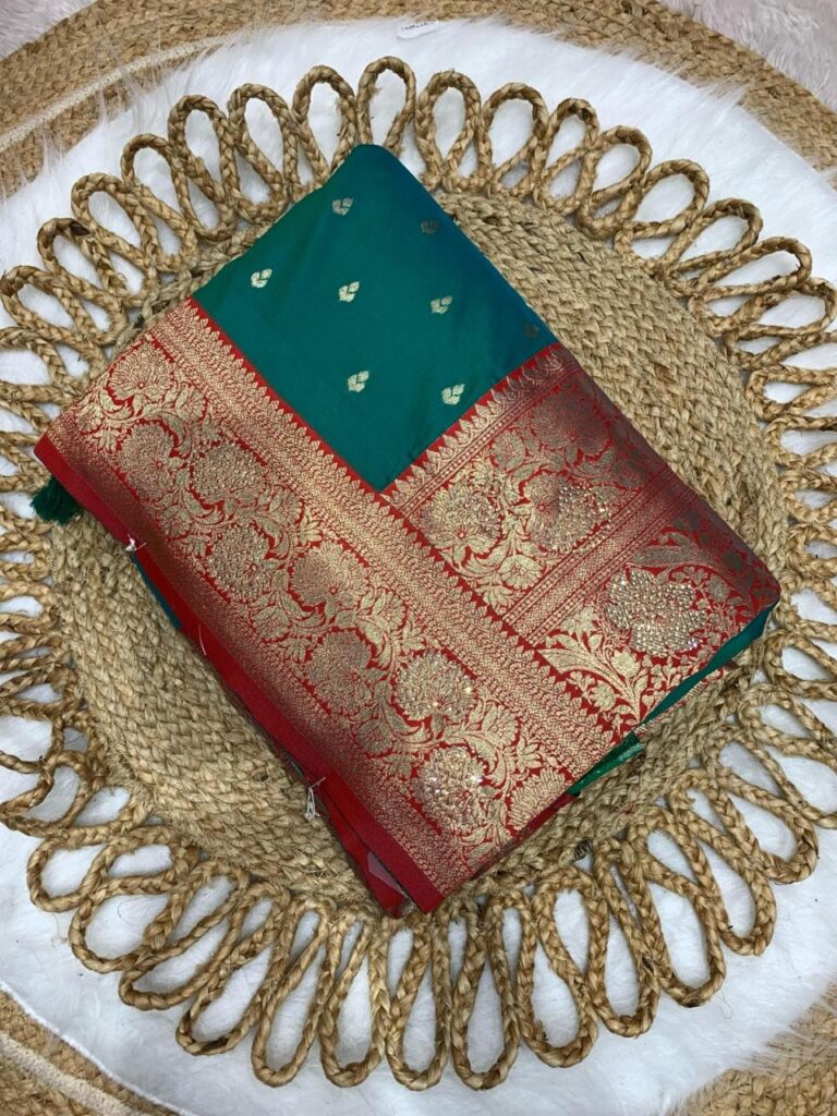 Discover elegance with our Teal Green Soft Silk Saree. Featuring a rich Red Zari border and intricate floral motifs, it’s the perfect choice for weddings and festivals.