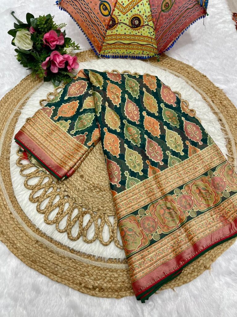 Floral Print Bottle Green Chiffon Saree with Zari Border