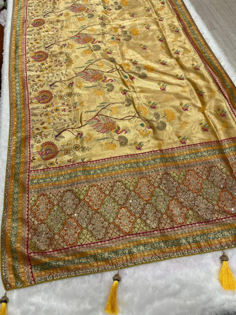 Gold Banarasi Silk Saree with Peacock Motifs & Zari Border